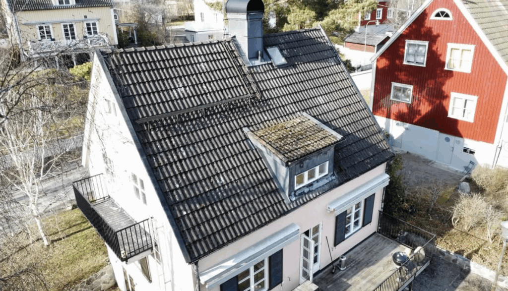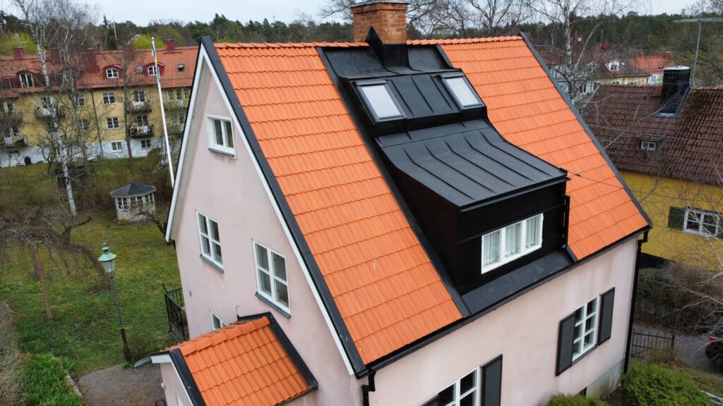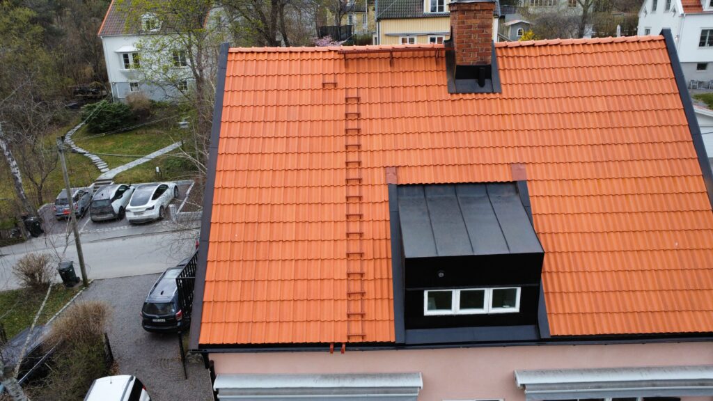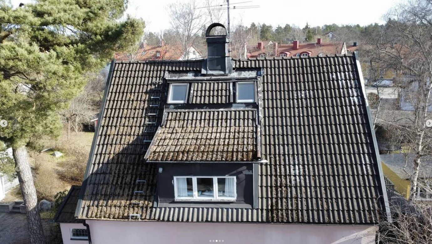 På detta objekt tog vi oss an ett tak som under 1970-talet genomgått en omfattande ombyggnad. I samband med den renoveringen hade delar av taket lyfts, vilket gav byggnaden ett helt annat och mer främmande uttryck än det ursprungliga. Samtidigt ersattes de ursprungliga tegelpannorna med betongpannor, något som ytterligare förändrade takets karaktär.