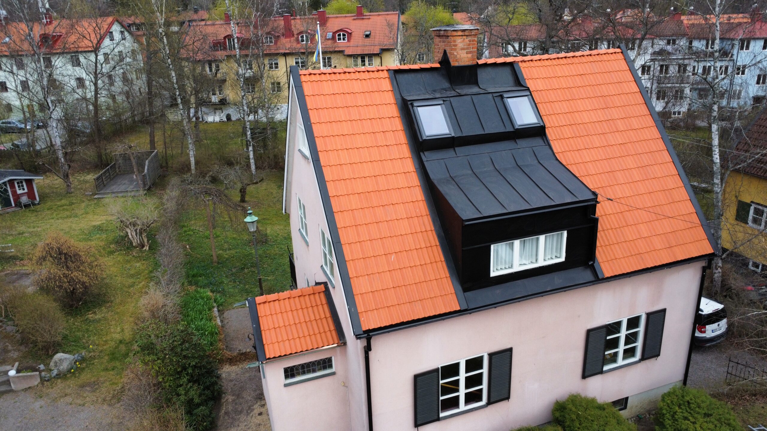 I vårt arbete utgick vi från husets proportioner och strävade efter att skapa en mer sammanhållen och genomarbetad helhet. De upplyfta takdelarna kläddes in i plåt, vilket resulterade i en tydlig plåtkupa på framsidan. Även kupan på baksidan kläddes in i plåt, med fokus på rena linjer och ett konsekvent utförande.