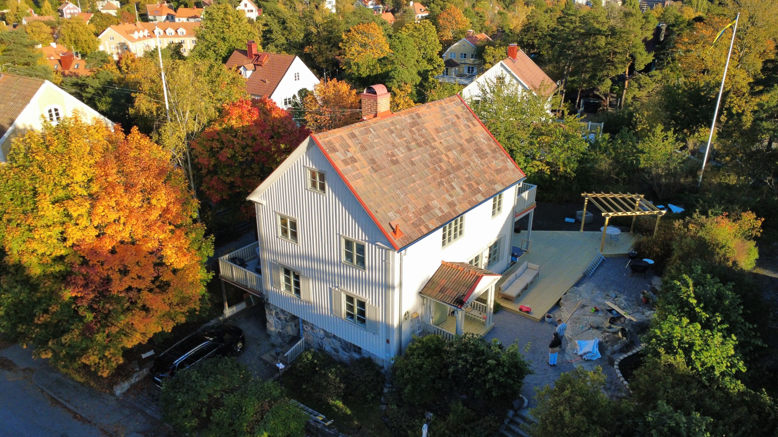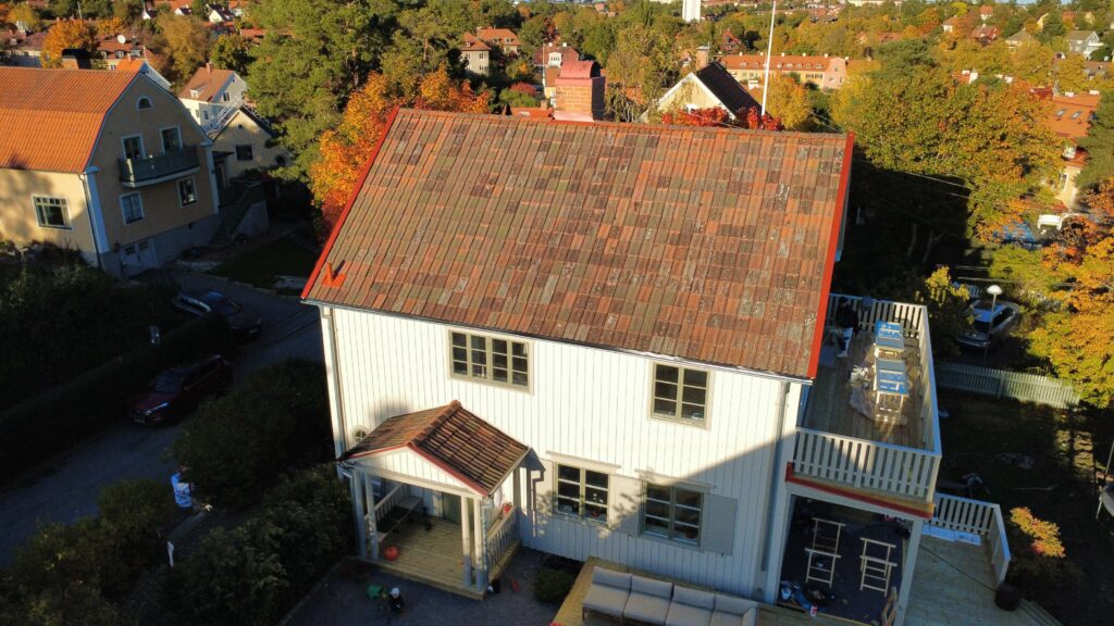 Resultatet är en villa där tak, fasad och utemiljö samverkar i ett sammanhållet uttryck – ett exempel på hur varsamt hantverk och genomtänkta materialval kan stärka både husets karaktär och dess framtida livslängd.
