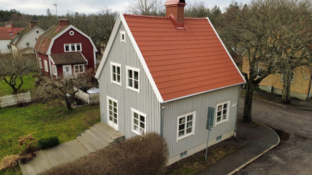 När vi tog oss an projektet var målet glasklart: att återställa takets ursprungliga känsla och samtidigt skapa en lösning som håller i många decennier framöver. Vi rev de gamla betongpannorna och lade istället nya, vackra tvåkupiga vittinge tegelpannor – ett material som både harmoniserar perfekt med husets tidsepok och patinerar på ett mycket tilltalande sätt över åren.