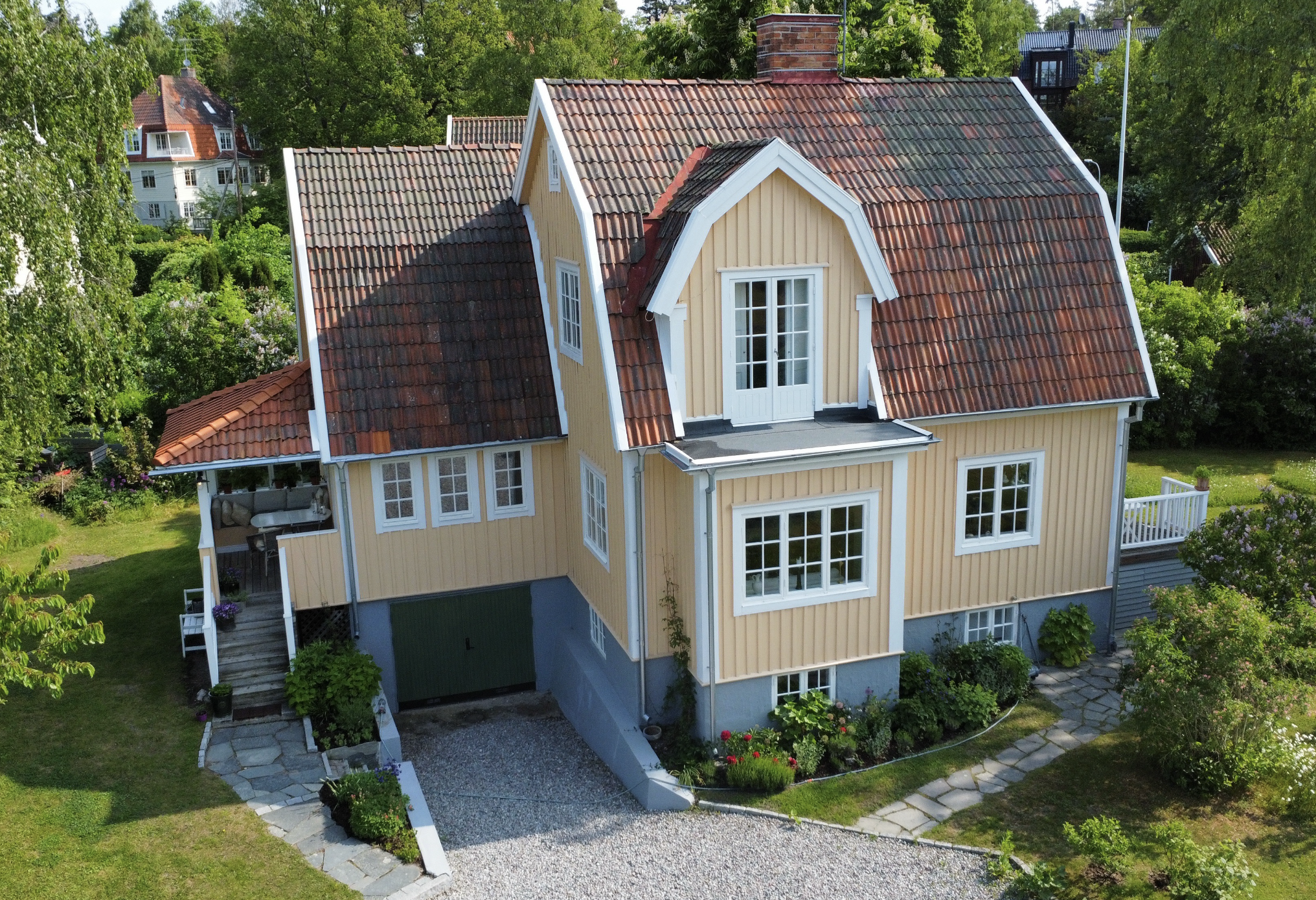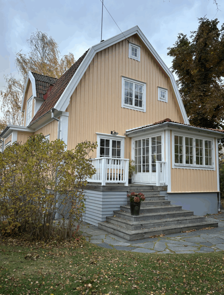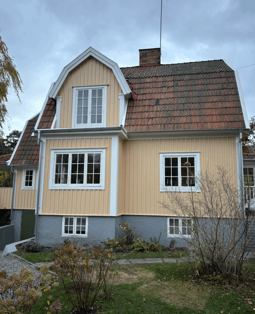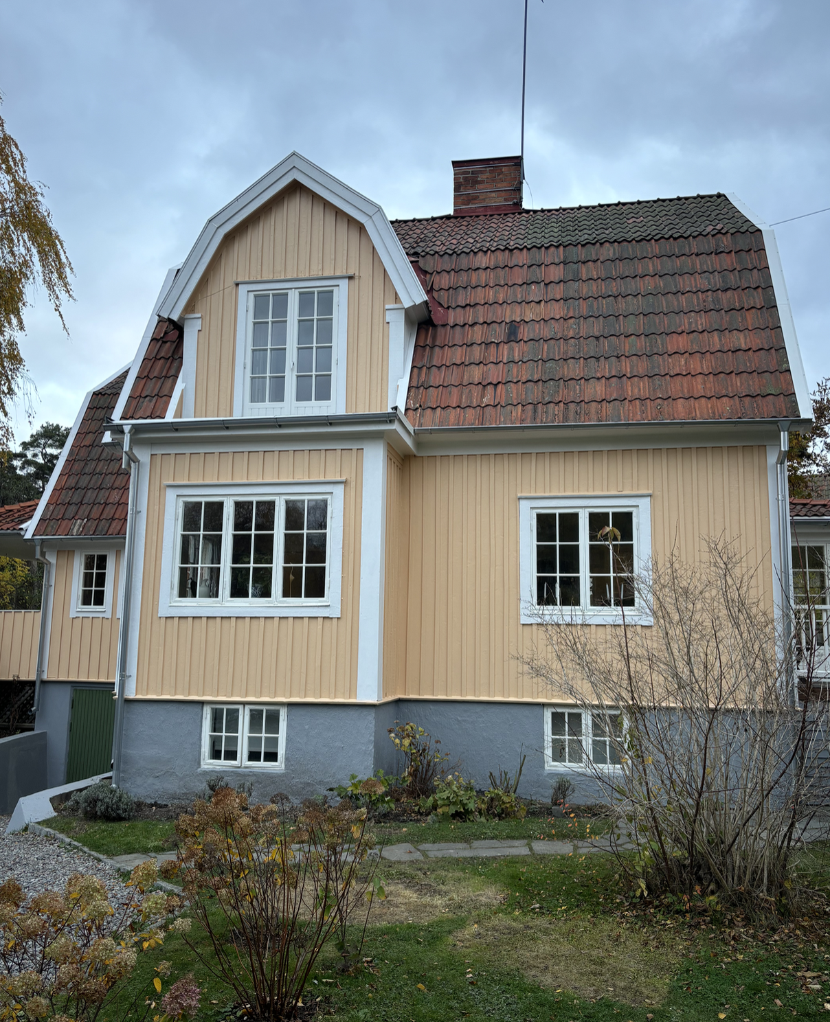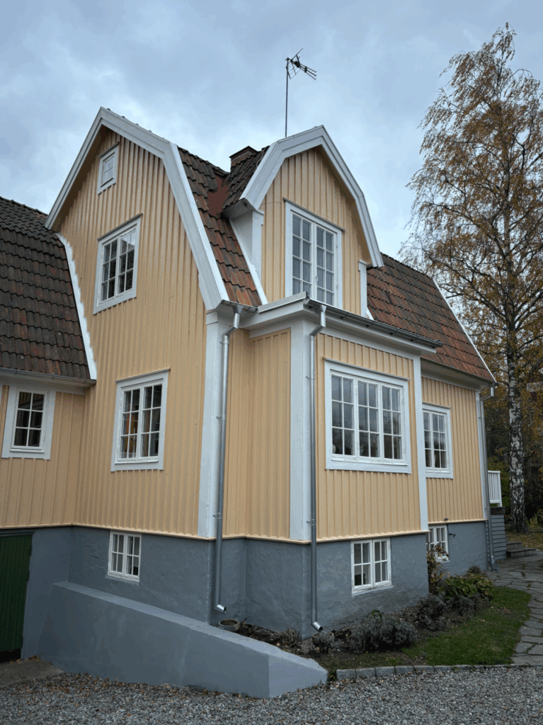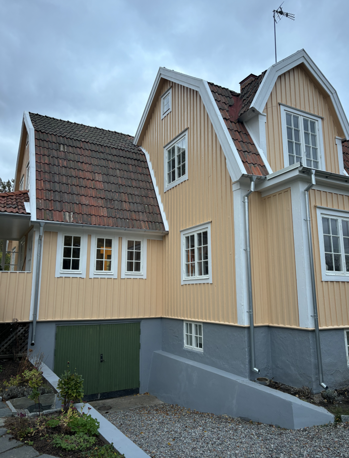 Denna vackra 20-talsvilla i Stocksund, med sin tidstypiska arkitektur och charmiga träfasad, genomgick en omfattande fasadrenovering och målning för att återfå sitt ursprungliga utseende och skyddas från elementen. För att säkerställa hållbarhet och kvalitet byttes allt rötskadat virke ut mot nytt, noggrant utvalt trä som matchade husets ursprungliga stil.