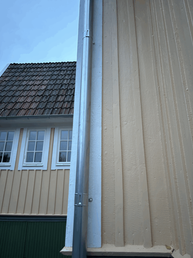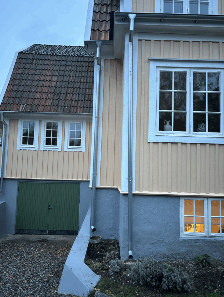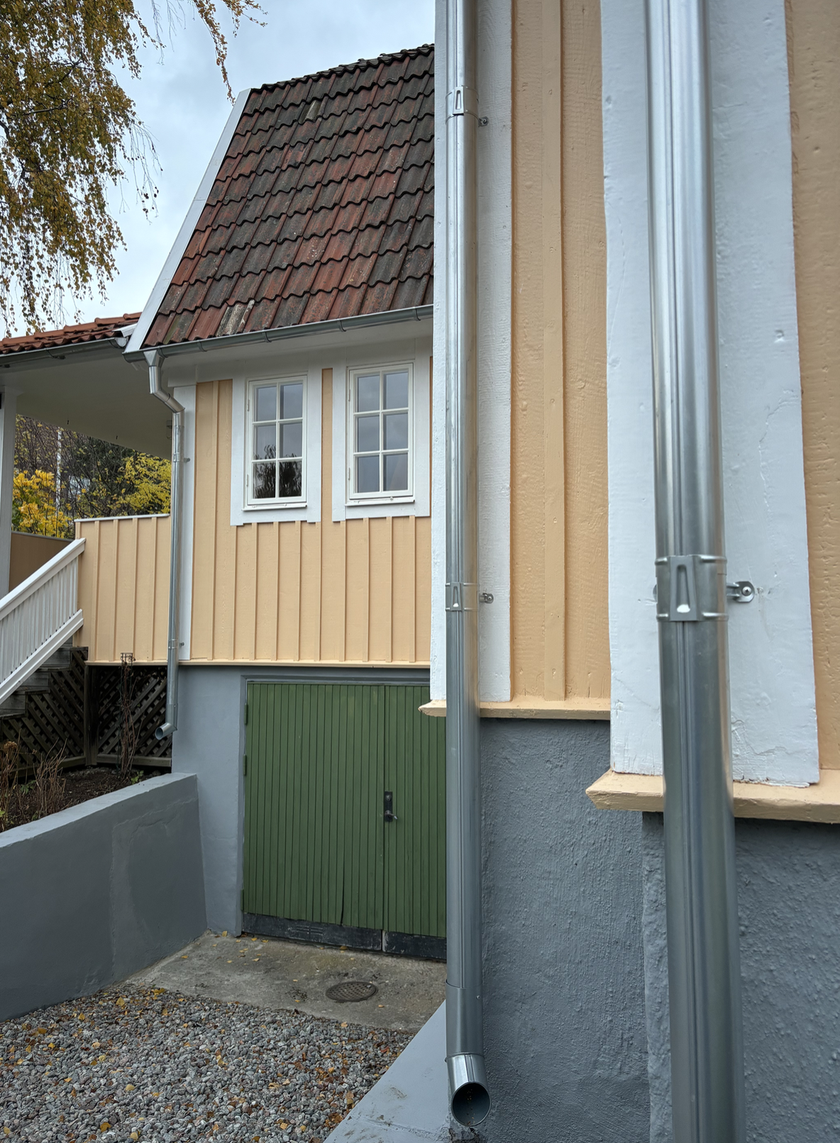 Som en del av renoveringen byttes även husets takavvattning ut. Det gamla systemet ersattes med nya hängrännor och stuprör i zink-magnesium, ett material som kombinerar modern prestanda med en vacker, naturlig patina som utvecklas över tid. Detta materialval var inte bara estetiskt utan också funktionellt, tack vare dess långa livslängd och låga underhållsbehov.